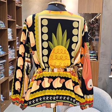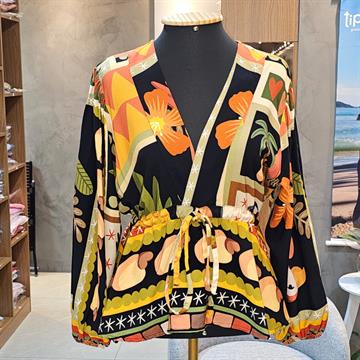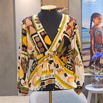 Blusa leve e soltinha com estampa geométrica e cores vibrantes, perfeita para compor looks cheios de estilo. Possui decote em V, mangas longas e detalhe com amarração na cintura, garantindo caimento confortável e elegante. Ideal para ocasiões casuais e sofisticadas.