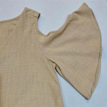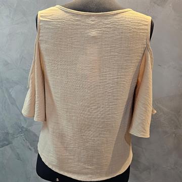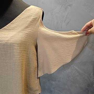 BLUSA CROPPED EM POLIESTER EXINIA BEGE MANGA CIGANA,QUE ADICIONA UM TOQUE DE ESTILO E MOVIMENTO Á PEÇA.