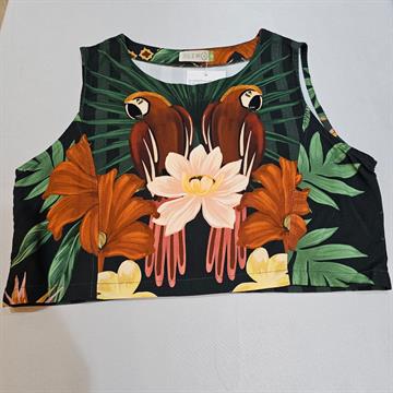 Um look cheio de personalidade para dias ensolarados! Cropped confeccionado em tecido leve e confortável, com estampa colorida vibrante que mistura elementos tropicais e geométricos. Modelo regata, com ótimo caimento e toque suave, ideal para compor produções fresquinhas e modernas.