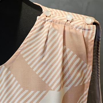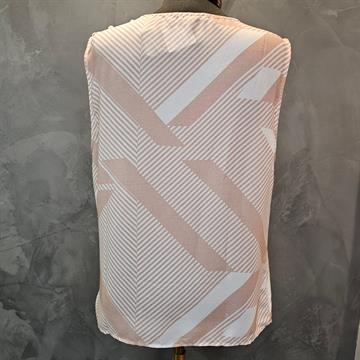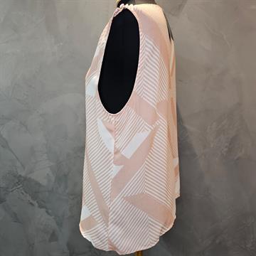 BLUSA FEMININA HARMONIA REGATA FEITA EM POLIÉSTER COM PADRÃO GEOMÉTRICO EM TONS DE BEGE E BOTÃO NO OMBRO