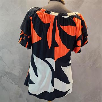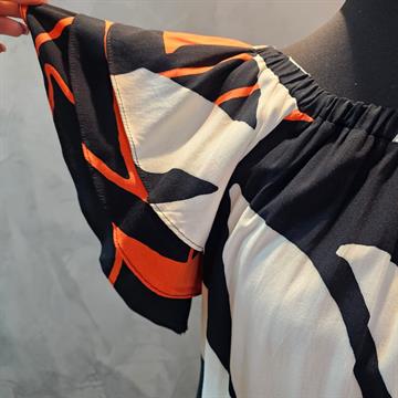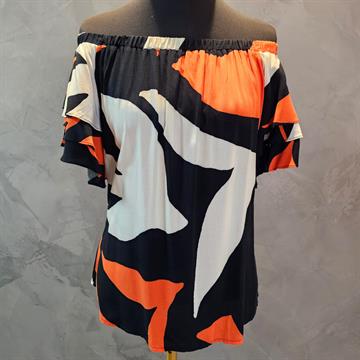 BLUSA FEMININA VISCOSE EXINIA ,ESTAMPA GEOMÉTRICA EM PRETO,BEGE E LARANJA ,COM MANGAS CUTAS E FRANZIDO NO DECOTE.