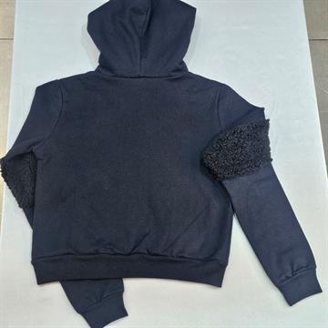 BLUSÃO JUVENIL FEMININO MOLETOM PRETO CEREJA ROSA COM CAPUZ FELPUDO E DETALHE FELPUDO NAS MANGAS. TAM 14