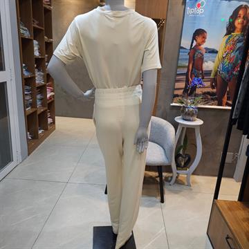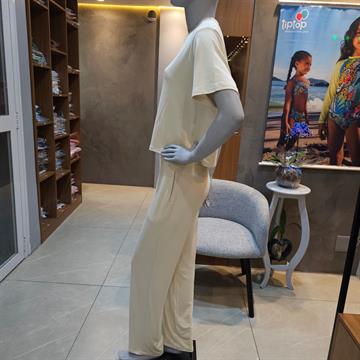 Ideal para quem ama conforto com estilo! Esse conjunto em malha leve e macia traz blusa de manga curta com modelagem soltinha e calça com cintura elástica, perfeita para o dia a dia ou momentos de relaxamento. Disponível em um tom neutro que combina com tudo!