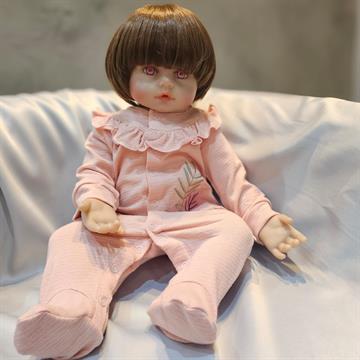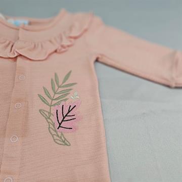 COM MANGAS LONGAS E PEZINHOS, TEM BABADINHOS DELICADOS NA FRENTE E NAS COSTAS, ALÉM DE UMA ENCANTADORA ESTAMPA BORDADA DE GALHOS DE FLORES EM UM SUAVE TOM DE ROSA ANTIGO